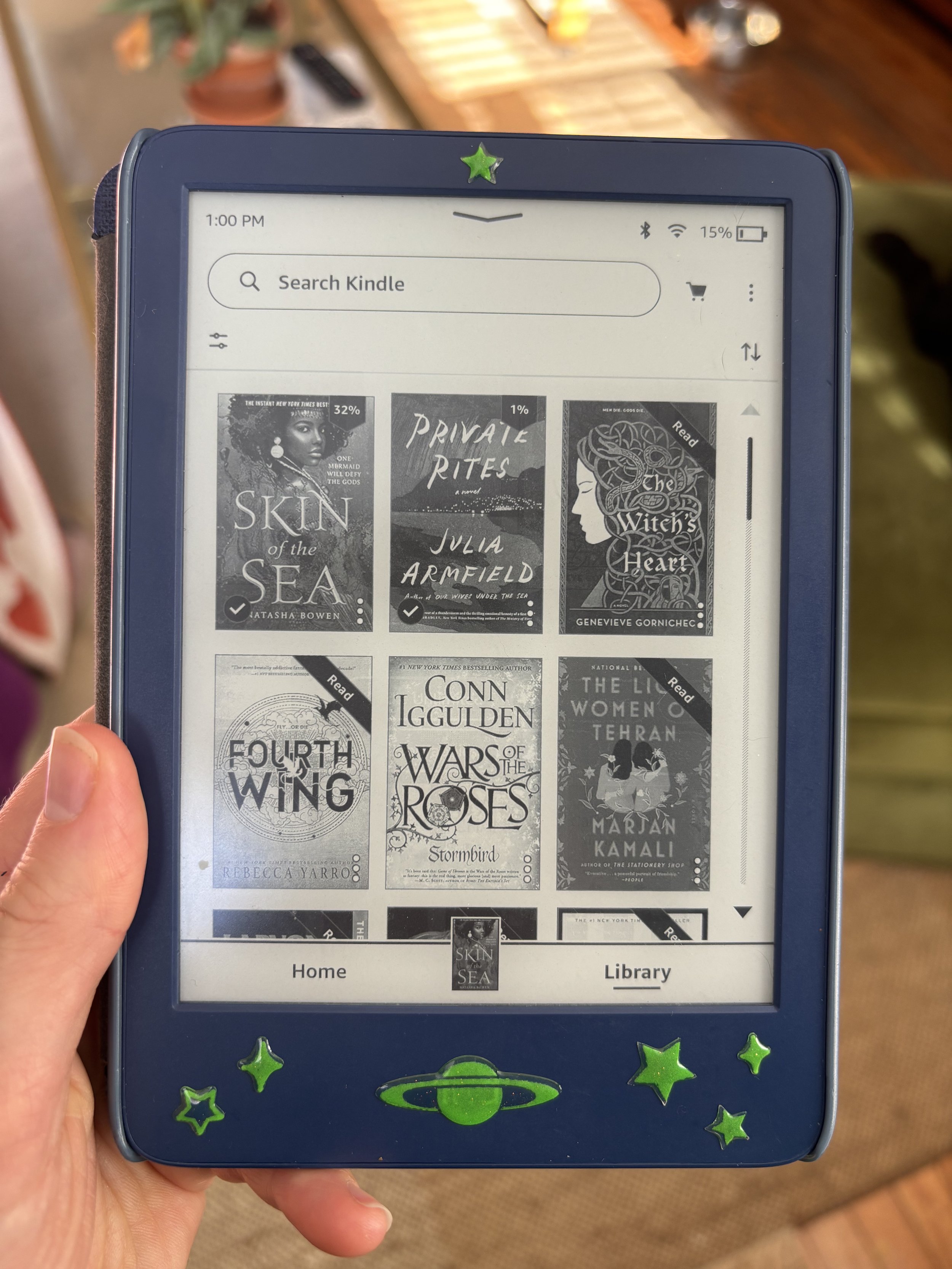 Covering my e-reader in glow in the dark stars; I love adding a little *whimsy* to the objects in my day-to-day life, and bonus, now I don’t have to look at a big brand name every time I read.