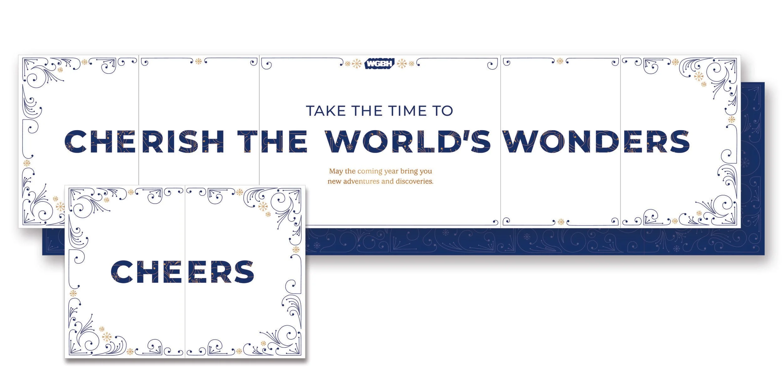 Design for WGBH’s 2019 corporate holiday card. This five-panel accordion folded card featured ornamental illustrations, and gold-foil finishing.
